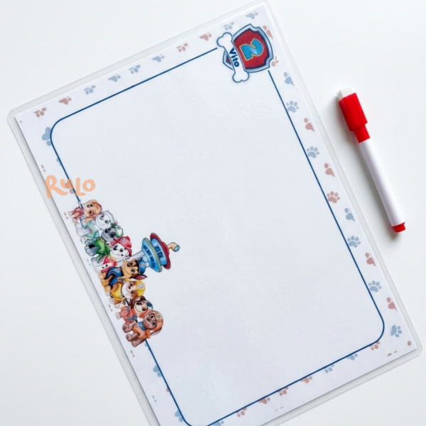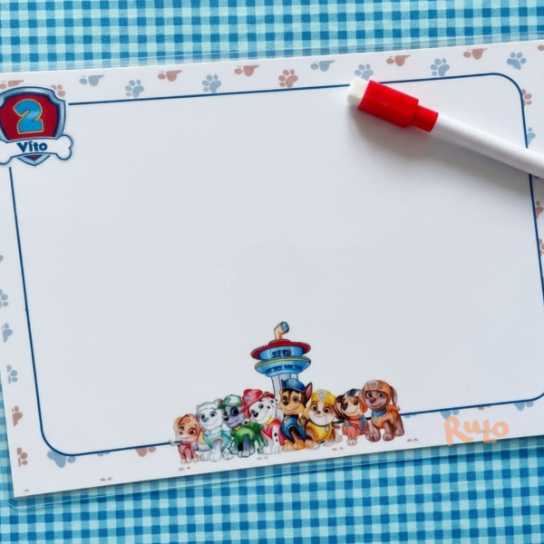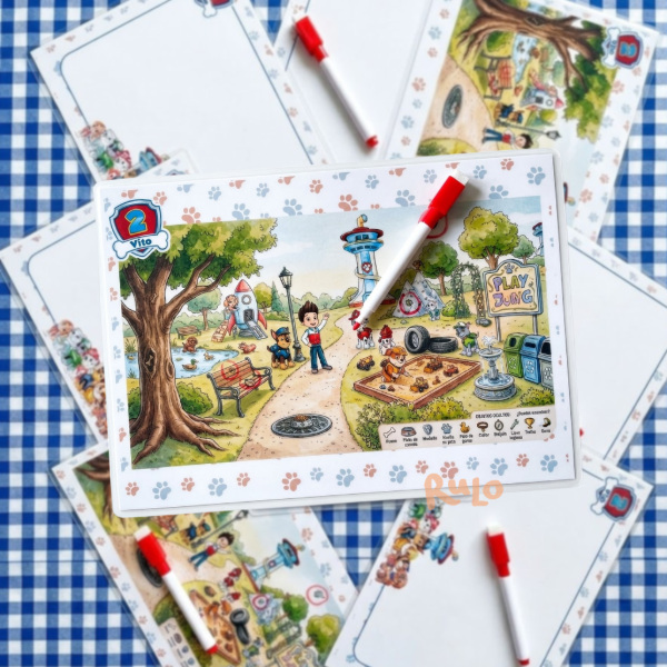 Cada pizarra se realiza de forma personalizada según la temática que elijas. De un lado es pizarra para escribir o dibujar, y del otro incluye una actividad tipo “buscá y encontrá”, donde pueden marcar, borrar y volver a jugar las veces que quieran.