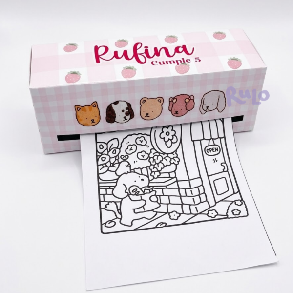 Una cajita original y divertida para sorprender en el cumpleaños de tu peque, que incluye un rollo para colorear ideal para entretener a los chicos .